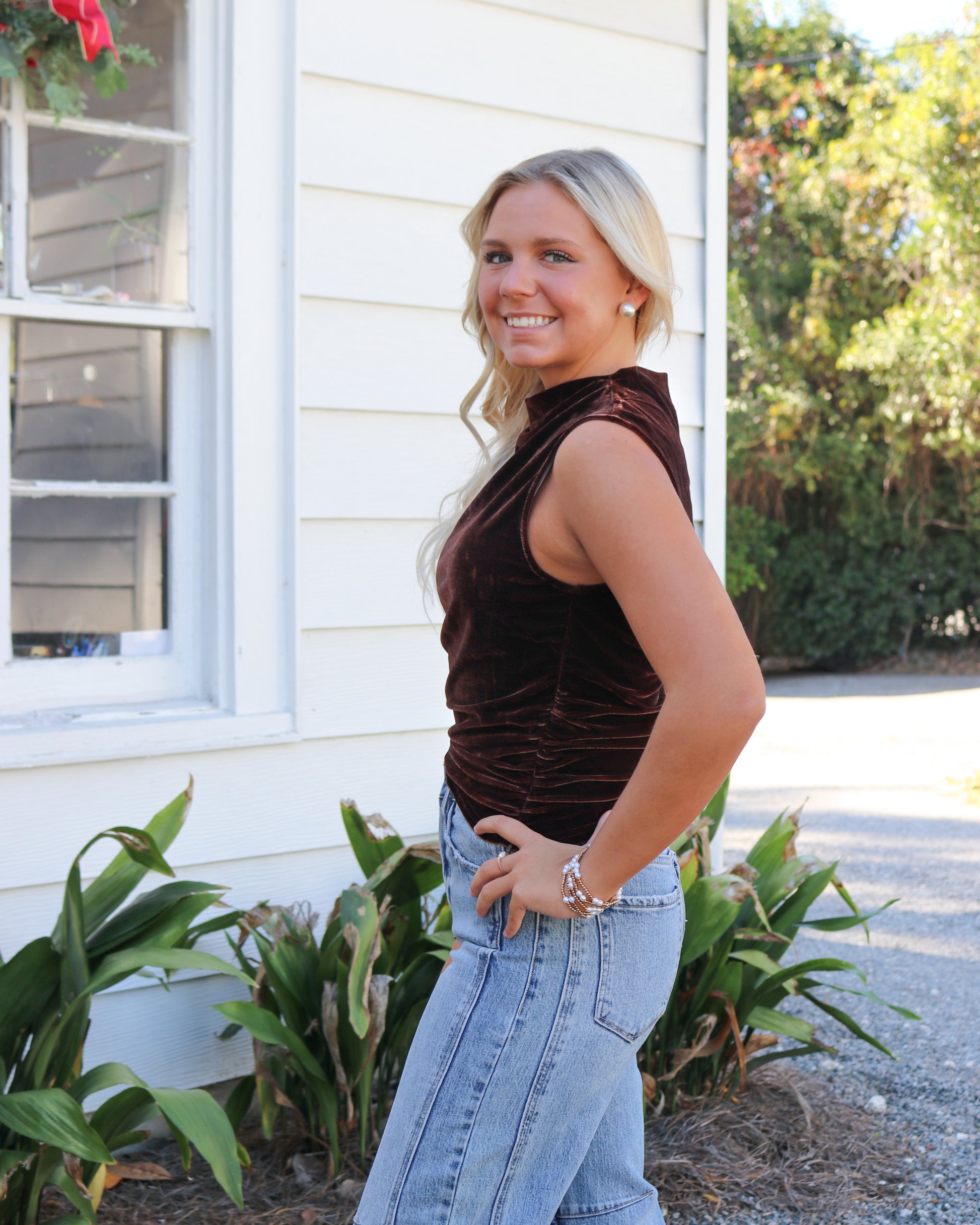 Indulge in style with our Velvet Top featuring flattering ruching and a High Neckline for a chic fit. The soft chocolate color velvet is an elegant option for neutral fashion. Dress it up or down for any occasion. Once you put it on you won’t want to take it off!